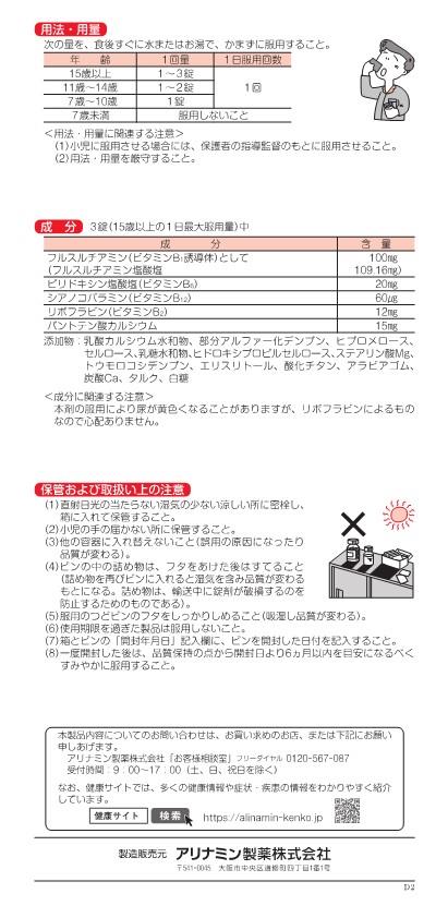 3錠中 成分:分量:内訳 フルスルチアミン:100mg:(フルスルチアミン塩酸塩109.16mg) ピリドキシン塩酸塩:20mg: シアノコバラミン:60μg: リボフラビン:12mg: パントテン酸カルシウム:15mg: