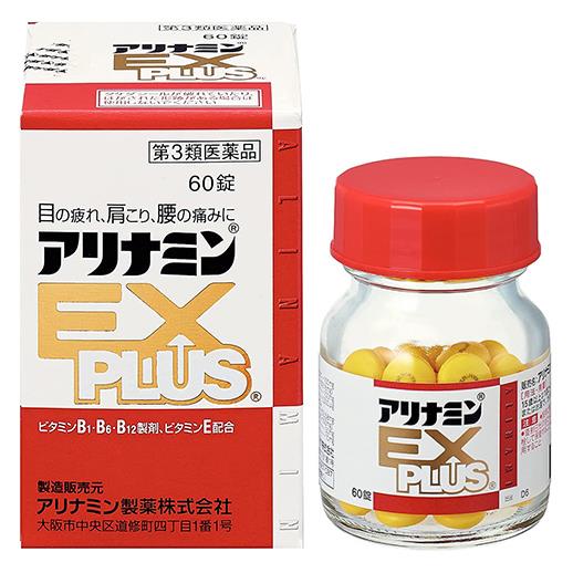 「アリナミン製薬 アリナミンEXプラス 120錠」は、吸収にすぐれたビタミンB1誘導体 フルスルチアミン、ビタミンB6、ビタミンB12を配合し、「目の疲れ」「肩こり」「腰の痛み」などのつらい症状にすぐれた効果をあらわします。補酵素(コエンザイムA)となってエネルギーの産生に重要な働きをするパントテン酸カルシウム、体のすみずみの血液循環に関与するビタミンEを配合しています。服用しやすい黄色の糖衣錠です。