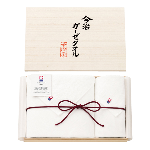 「今治タオル ガーゼ 大判バス・ウォッシュタオルセット IMG-300」は、ガーゼとパイルの二重織りで吸水性がよく肌にやさしいタオルです。木箱に入れて豪華に仕上げました。バスタオル×1枚、ウォッシュタオル×1枚。