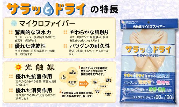 ■次の要因によって吸水性が落ちることがあります。ご注意ください。 ・アイロンがけ。 ・衣類乾燥機の使用。 ・柔軟材・漂白剤の使用。 ・洗剤、粉石鹸の入れ過ぎ ■色落ちの恐れがありますので、タオル購入後初めのうちは単独洗濯をしてください。また白色の洗濯物と一緒に洗わないでください。 ■濡れたまま長時間放置すると、カビの原因となります。使用後・洗濯後は風通しの良い所に干し、十分に乾かしてください。 ■お顔や体にご使用になる場合はこすらず押さえるようにお使いください。 ■光触媒の効果を発揮させる為には、光(紫外線)が必要です。天日干しをして、太陽の光を十分にあててください。