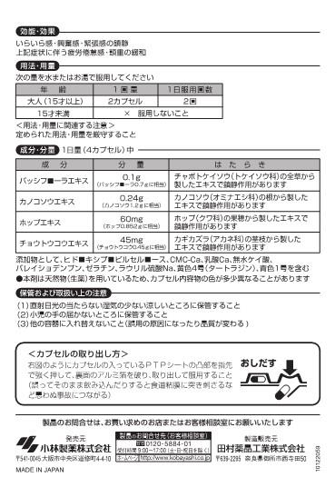 4カプセル中 成分:分量:内訳 パッシフローラエキス:0.1g:(パッシフローラ0.7g) カノコソウエキス:0.24g:(鹿子草1.2g) ホップエキス:60mg:(ホップ0.852g) チョウトウコウエキス:45mg:(釣藤鈎0.45g)