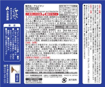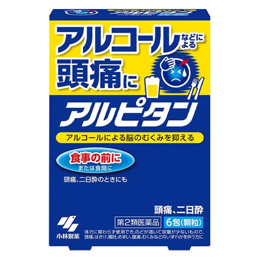 「小林製薬 アルピタン 6包」は、アルコールなどによる頭痛、二日酔に効く漢方処方「五苓散」です。アルコールの分解促進と、体内の水分バランス調整により、つらい頭痛や二日酔を抑えます。素早く溶ける顆粒タイプです。