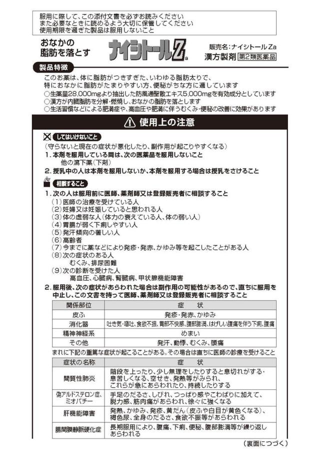 「ナイシトールZa 150錠」は、体に脂肪がつきすぎた、いわゆる脂肪太りで、特におなかに脂肪がたまりやすい方、便秘がちな方に適しています。生薬量28,000mgより抽出した防風通聖散エキス5,000mgを有効成分とし、内臓脂肪を分解・燃焼し、おなかの脂肪を落とします。生活習慣などによる肥満症や、高血圧や肥満に伴うむくみ・便秘の改善に効果があります。