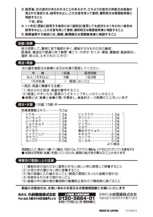 1日量(15錠中) 成分:分量:内訳 防風通聖散エキス:5.0g:(トウキ1.2g、シャクヤク1.2g、センキュウ1.2g、サンシシ1.2g、レンギョウ1.2g、ハッカ1.2g、ショウキョウ1.2g、ケイガイ1.2g、ボウフウ1.2g、マオウ1.2g、ダイオウ1.5g、無水ボウショウ(硫酸ナトリウム)1.5g、ビャクジュツ2.0g、キキョウ2.0g、オウゴン2.0g、カンゾウ2.0g、セッコウ2.0g、カッセキ3.0g)