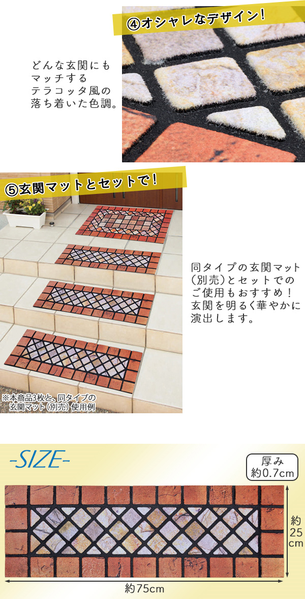 「石タイル調の階段マット テラコッタ」は、石タイル調の屋外用階段マットです。表面の凹凸が靴底の泥や汚れをしっかり落とします。裏面はゴム加工でズレやまくれを防ぎます。汚れたら水洗い可能でお手入れカンタン。戸建ての玄関ポーチに多い2〜3段の階段の滑り止め・泥落としに最適です。どんな玄関にもマッチするテラコッタ風の落ち着いた色合いがおしゃれなデザイン。玄関を華やかに演出します