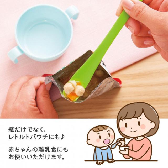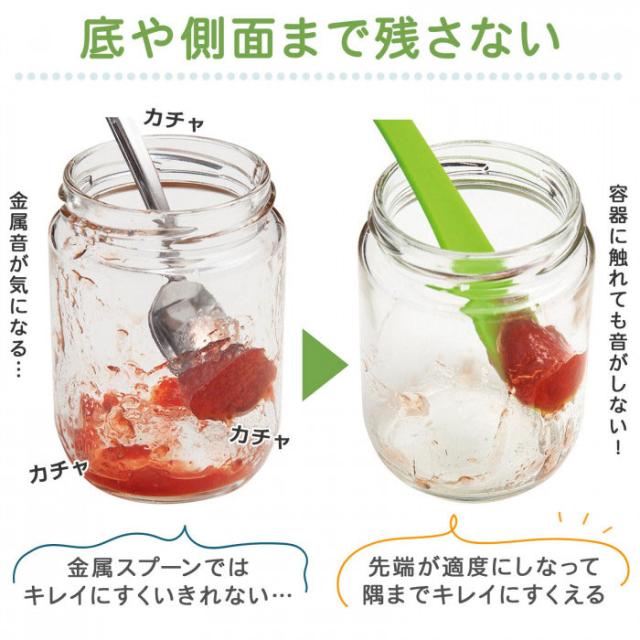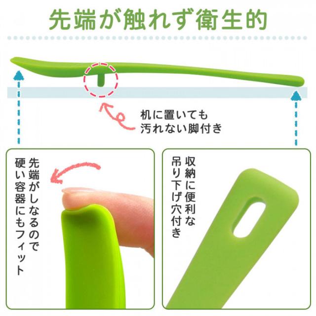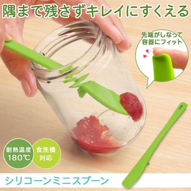 「シリコーンミニスプーン」は、脚付きなので、先端が机に触れない設計で衛生的に使えます。先端は適度にしなって隅までキレイにすくいやすい。瓶の他にレトルトパウチにも使えます。赤ちゃんの離乳食にも。継ぎ目が無く、洗いやすくお手入れも簡単です。