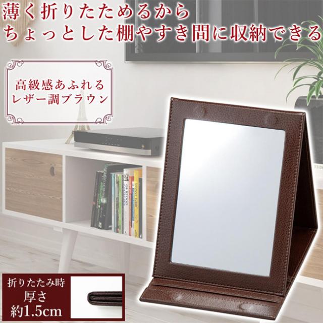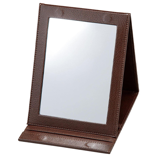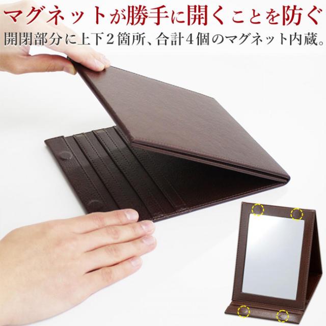 「折立鏡コンパクトミラー」は、角度を4段階調節できる折りたたみ式ミラーです。ロックラインが3箇所に入っており、4段階に角度を調節できます。使用しない際は折りたたんで収納できます。開閉部4箇所にマグネットが付いており、勝手に開いてしまうことを防ぎます。