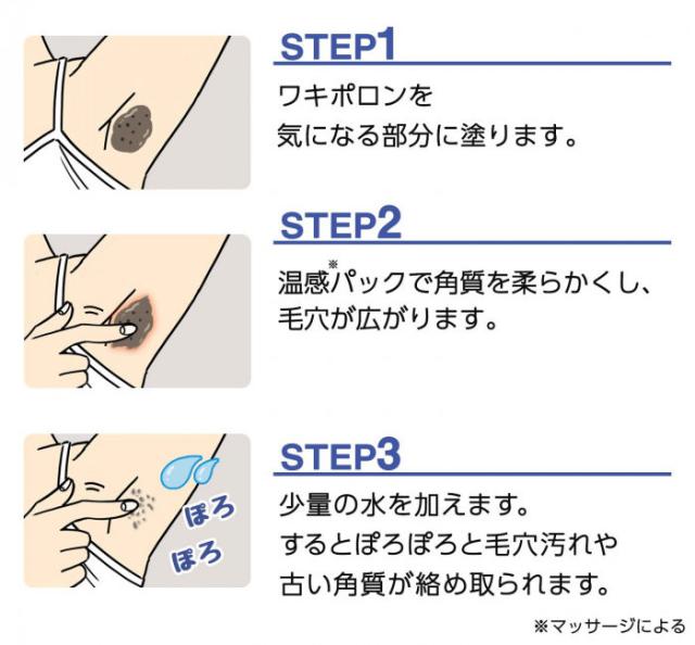 「ビューナ ワキポロン」は、ワキ用ピーリングジェルです。厚めに塗布し、マッサージすることにより温感パックで角質をやわらかくし毛穴を広げます。少量の水をつけてくるくるマッサージするとぽろぽろと毛穴汚れや古い角質汚れが絡め取られます。また、ひざやひじなどの気になる部分にも使用できます。4つのワキケア成分(アーチチョーク、ダイズ種子エキス、豆乳発酵液、コメヌカ油)配合でツルワキへ。柿タンニンエキス配合。