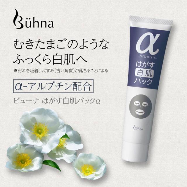 「ビューナ はがす白肌パックα 60g」は、α-アルブチン(保湿成分)を配合した剥がすタイプのパックです。くすみ(古い角質汚れ)をオフすることにより、お肌を整え透明感のある素肌へ導きます。