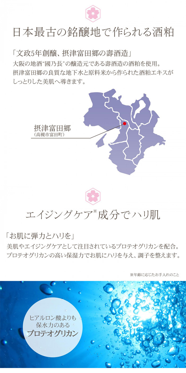 水、酒粕エキス、水溶性プロテオグリカン、加水分解酵母エキス、コメヌカエキス、リンゴ酸、プルラン、キサンタンガム、BG、フェノキシエタノール