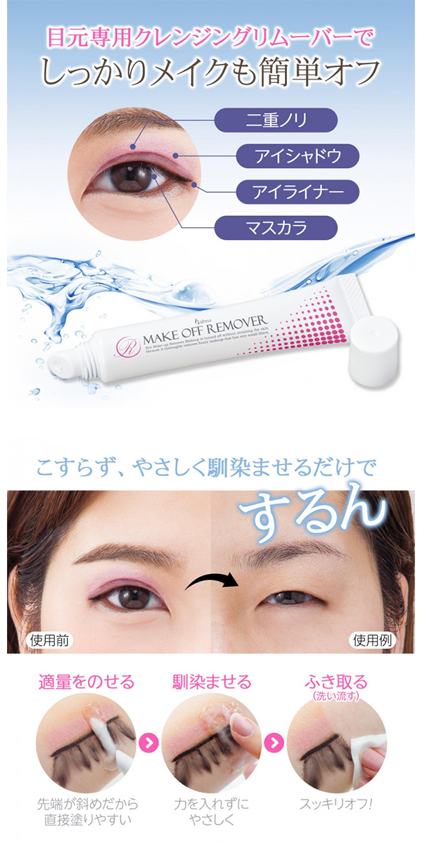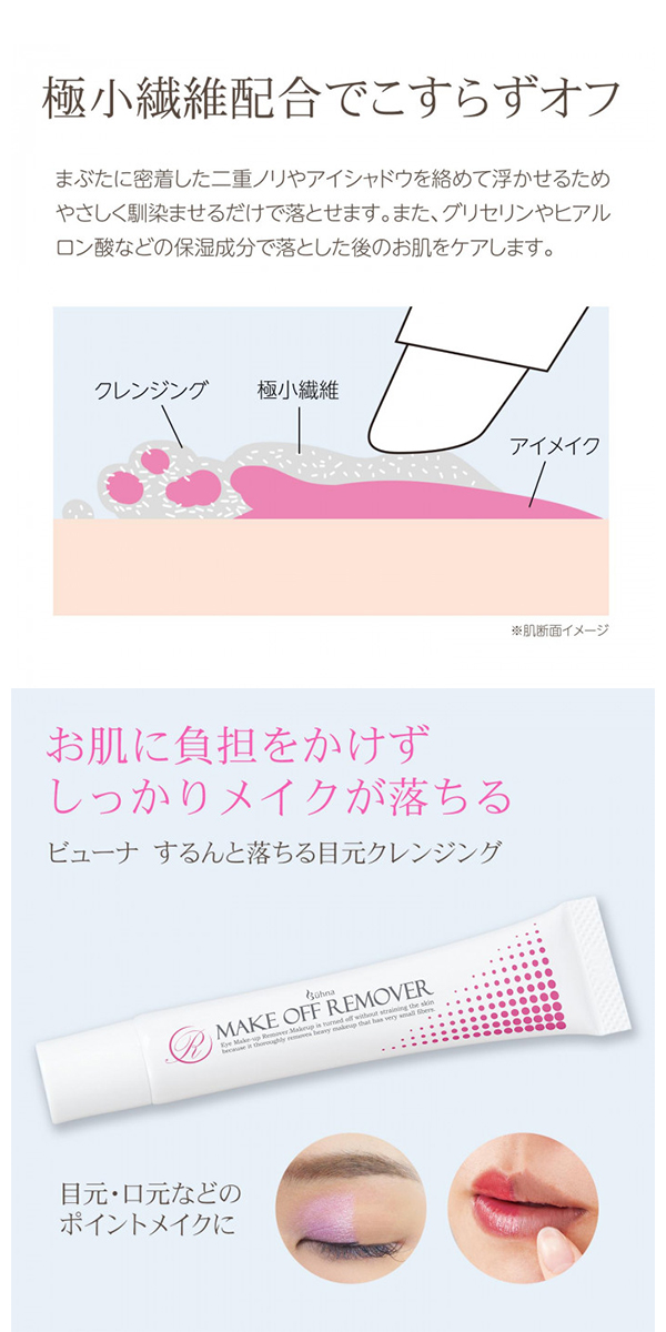 「ビューナ するんと落ちる目元クレンジング 20g」は、目元用に特化したクレンジングリムーバーです。極小繊維がまぶたに密着した二重メイクやアイシャドウを絡め取ります。直塗りできる斜めカットチューブ。デリケートなまぶたに使えるアルコールフリー処方。口紅落としとしても使えます。