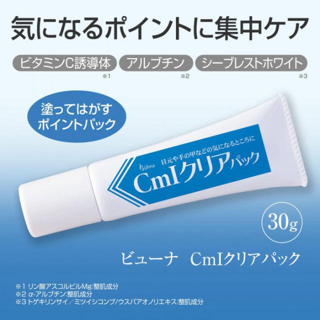 「ビューナ CmIクリアパック 30g」は、気になる部分に塗り込む集中パックです。パックの色が茶色く変わったら剥がします。プラセンタエキスをはじめビタミンC誘導体、シーブレストホワイト、ルナホワイト配合のパックがターゲットエリアにアプローチ。手やボディの気になる部分にもご使用いただけます。