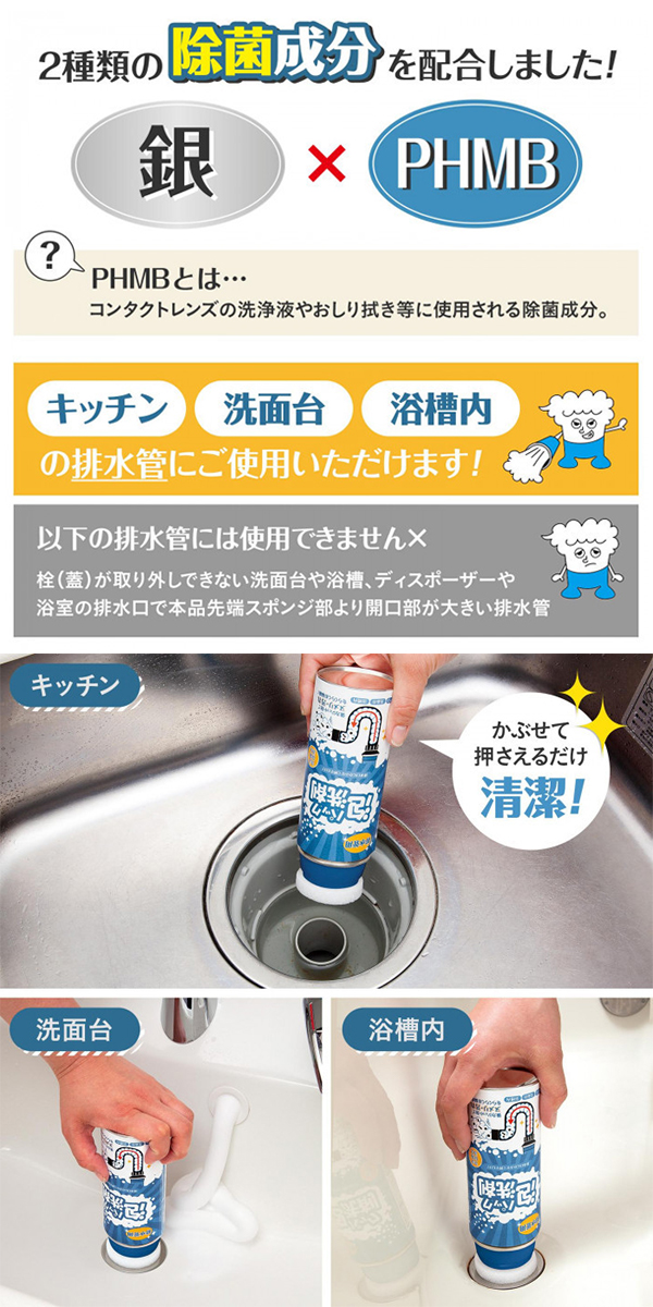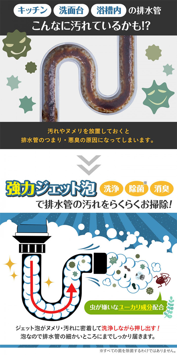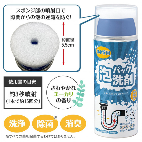「泡パック洗剤 排水管用 280ml」は、強力ジェット泡が汚れに密着して洗浄しながら押し出します。泡なので細かいところにもしっかり届きます。排水口にかぶせて押さえるだけなので、手を汚さず便利。2種類の除菌成分(銀×PHMB)配合。さわやかなユーカリの香り。
