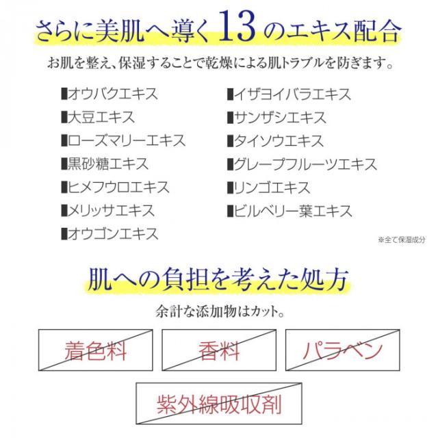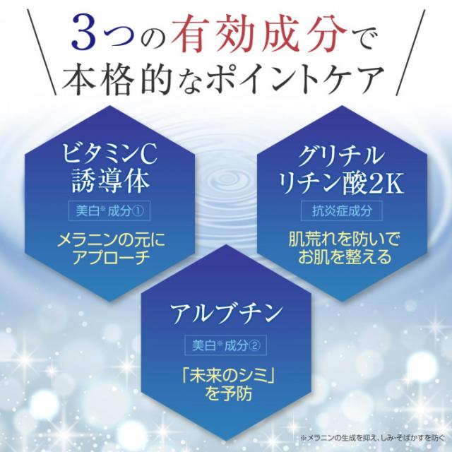 有効成分:ビタミンC・2−グルコシド、アルブチン、グリチルリチン酸2K その他の成分:オウバクエキス、ノニ果汁、大豆エキス、ライム果汁、ローズマリーエキス、ジラウロイルグルタミン酸リシンナトリウム液、オレンジ果汁、黒砂糖エキス、ヒメフウロエキス、メリッサエキス、レモン果汁、オウゴンエキス、レモングラス抽出液、イザヨイバラエキス、パイナップルセラミド、サンザシエキス、タイソウエキス、グレープフルーツエキス、リンゴエキス、ビルベリー葉エキス、水添大豆リン脂質、シュガースクワラン、エチルヘキサン酸セチル、1,3−プロパンジオール、ベヘニルアルコール、濃グリセリン、BG、SEステアリン酸グリセリル、1,2−ペンタンジオール、アラキルグルコシド・アラキルアルコール・ベヘニルアルコール、ステアリン酸ポリグリセリル、POE硬化ヒマシ油、グリコシルトレハロース・水添デンプン分解物混合溶液、メドウフォーム油、ジメチコン、アクリル酸・メタクリル酸アルキル共重合体、グリセリンエチルヘキシルエーテル、グリセリン脂肪酸エステル、キサンタンガム、エタノール、天然ビタミンE、ピロ亜硫酸Na、水酸化Na、無水クエン酸、ジエチレントリアミン5酢酸5Na液、ヒドロキシエタンジホスホン酸液、フェノキシエタノール、精製水