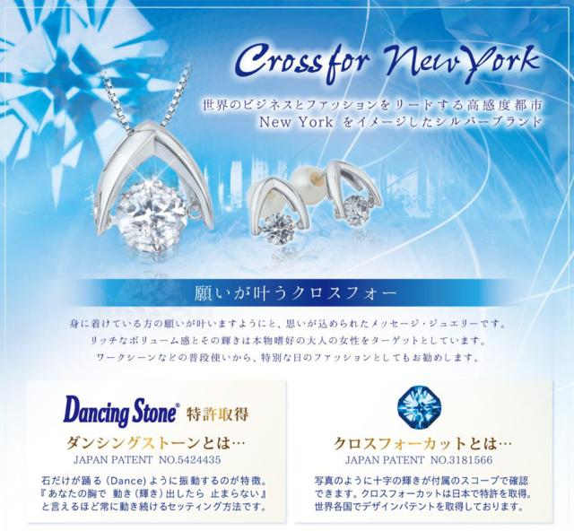 「クロスフォーニューヨーク ダンシングストーン NYP-617」は、身に着けている方の願いが叶いますようにと、思いが込められたメッセージジュエリーです。ダンシングストーンは、石だけが踊るように振動するのが特徴。左右の丸カンで結ばれて、前後に細かく揺れて輝きます。美しく見えるよう女性の胸の角度に合わせて設計されています。十字が浮かぶクロスフォーカット。