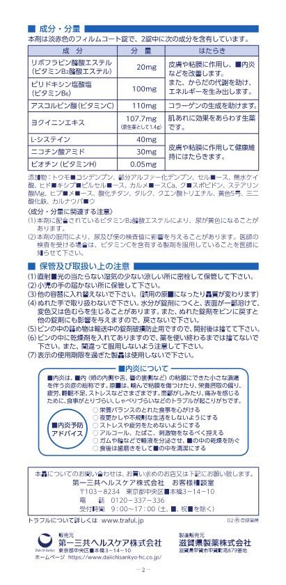 2錠中 成分:分量:内訳 リボフラビン酪酸エステル(ビタミンB2酪酸エステル):20mg: ピリドキシン塩酸塩(ビタミンB6):100mg: アスコルビン酸(ビタミンC):110mg: ヨクイニンエキス:107.7mg:(原生薬として1.4g) L-システイン:40mg: ニコチン酸アミド:30mg: ビオチン(ビタミンH):0.05mg:
