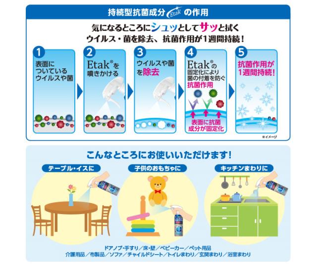 「エーザイ イータック抗菌化スプレーアルファ 250ml」は、ドアノブやテーブルなど、気になるところにスプレーするだけで、Etak?(持続型抗菌成分)によりスプレーした部分のウイルスや細菌の繁殖を防ぎます。赤ちゃんやペットの身の回り用品にも使用できます。Etak?はスプレーした直後の抗菌作用だけでなく、抗菌成分が対象物表面に固定されるため、乾燥した後も抗菌作用が1週間持続します。