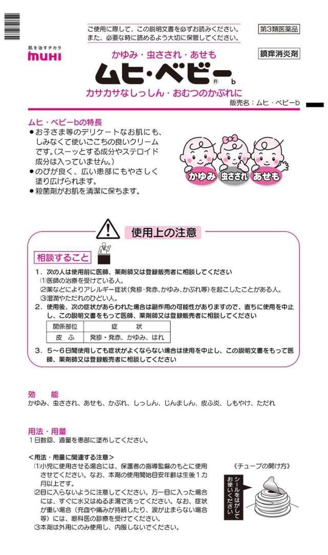 「ムヒ・ベビーb」は、お子さまの肌トラブルの常備薬として、虫さされやあせも、おむつのかぶれなど、幅広くご利用いただけます。スーッとする成分(メントール)やステロイド成分を配合していませんので、生後1カ月から使用でき、しみなくて使い心地の良いクリームです。顔にもご使用いただけます。