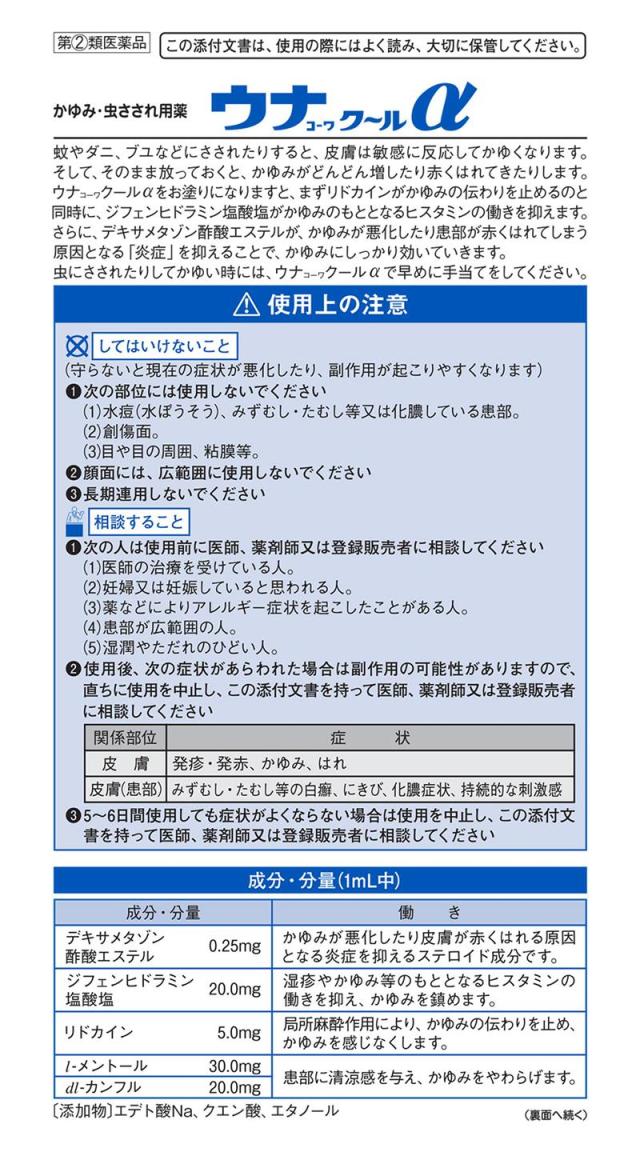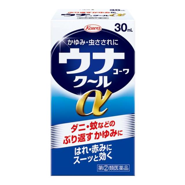 「ウナコーワクールα 55mL」は、赤みが残る虫さされ、かゆみに効く!デキサメタゾン酢酸エステルを配合した虫さされ、かゆみ治療薬です。 かゆみをすばやく、しっかり抑えます。リドカインがかゆみの伝わりを止めると同時に、ジフェンヒドラミン塩酸塩がかゆみのもととなるヒスタミンの働きを抑えます。ステロイド成分のデキサメタゾン酢酸エステルがかゆみの悪化や皮膚の赤みの原因となる炎症を抑えます。