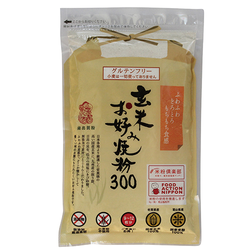「玄米お好み焼粉 300g」は、小麦粉を使用せずに、国産米粉と、国産玄米でつくった寒梅粉をブレンドしたお好み焼き粉です。