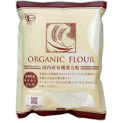 「青森産有機薄力粉 500g」は、希少性のある有機薄力粉です。青森産有機小麦100%。菓子作りや天ぷらなどにご使用ください。有機JAS認定品。