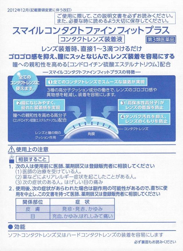 「スマイルコンタクトファインフィットプラス」は、レンズ装着時、直接1〜3滴つけるだけでゴロゴロ感を抑え、瞳にスッとなじんで、レンズ装着を容易にします。コンドロイチン硫酸エステルナトリウムは角膜を保護し、3種の高分子クッション成分がコンタクトの乾燥を防止します。