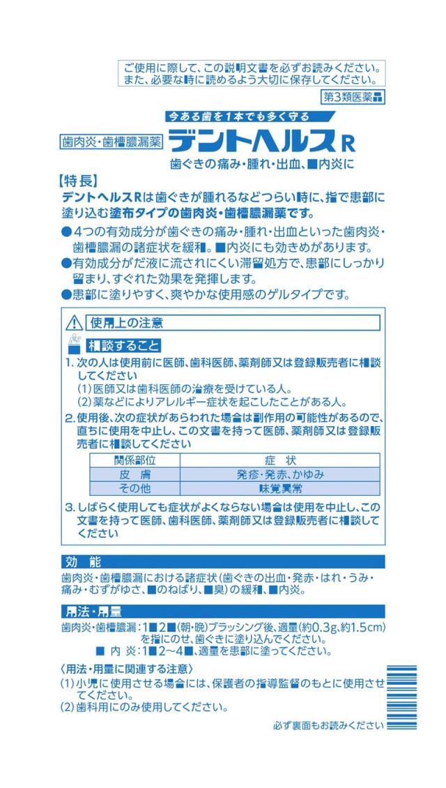 「デントヘルスR 10g」は、歯ぐきが腫れるなどつらい時に,指で患部に塗り込む塗布タイプの歯肉炎・歯槽膿漏薬です。4つの有効成分が歯ぐきの痛み・腫れ・出血といった歯肉炎・歯槽膿漏の諸症状を緩和。口内炎にも効きめがあります。有効成分がだ液に流されにくい滞留処方で、患部にしっかり留まり,すぐれた効果を発揮します。患部に塗りやすく、爽やかな使用感のゲルタイプです。