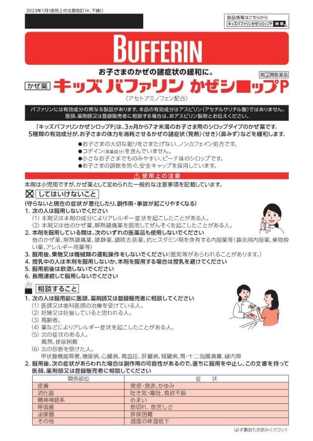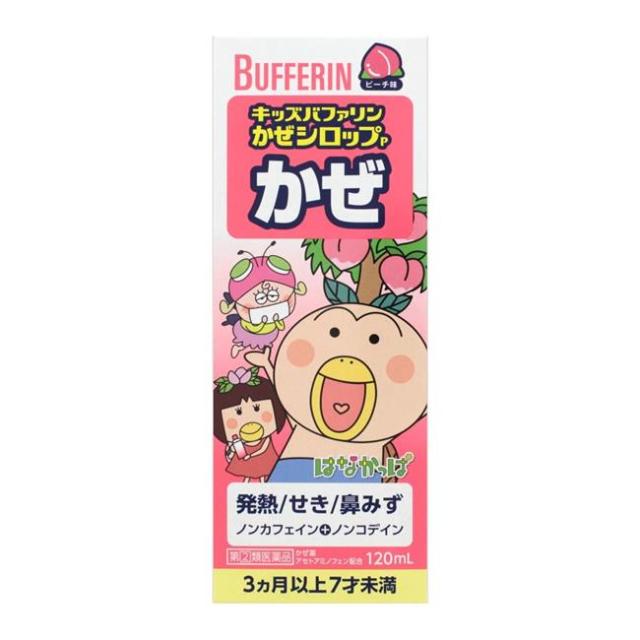 「キッズバファリンかぜシロップP 120ml」は、3ヵ月から7才未満のお子さま用のシロップタイプのかぜ薬です。5種類の有効成分が、お子さまの体力を消耗させるかぜの諸症状〈発熱〉〈せき〉〈鼻みず〉などを緩和します。お子さまの大切な眠りをさまたげない、ノンカフェイン処方です。コデイン(麻薬成分)を含んでいません。小さなお子さまでものみやすい、ピーチ味のシロップです。お子さまの誤飲を防ぐ、安全キャップを採用しています。