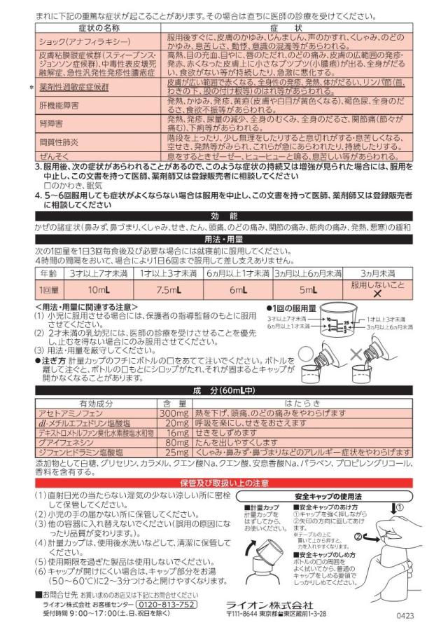 60mL中 成分:分量 アセトアミノフェン:300mg dl-メチルエフェドリン塩酸塩:20mg デキストロメトルファン臭化水素酸塩水和物:16mg グアイフェネシン:80mg ジフェンヒドラミン塩酸塩:25mg