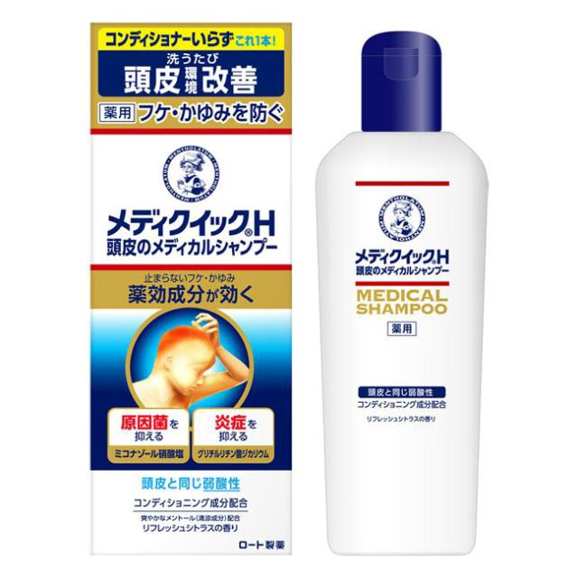 「メディクイックH 頭皮のメディカルシャンプー 200ml《医薬部外品》」は、フケ・かゆみを防ぐメディカルシャンプーです。原因菌の増殖を抑える抗真菌成分ミコナゾール硝酸塩と炎症を抑えるグリチルリチン酸ジカリウムを配合。アミノ酸系洗浄料で地肌へのやさしさにこだわりました。頭皮と同じ弱酸性、ノンシリコン。コンディショニング成分配合のシャンプーです。200ml入。