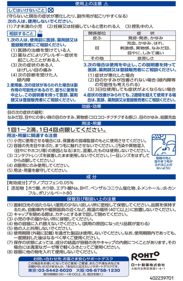 ■してはいけないこと (守らないと現在の症状が悪化したり、副作用が起こりやすくなる) 次の人は、使用しないでください (1)7才未満の小児 (2)妊婦又は妊娠していると思われる人 (3)授乳中の人 ■相談すること 1.次の人は使用前に医師、薬剤師又は登録販売者にご相談ください。 (1)医師の治療を受けている人 (2)薬などによりアレルギー症状を起こしたことがある人 (3)次の症状のある人 はげしい目の痛み (4)次の診断を受けた人 緑内障 2.使用後、次の症状があらわれた場合は副作用の可能性があるので、直ちに使用を中止し、この説明書を持って医師、薬剤師又は登録販売者にご相談ください [関係部位:症状] 皮ふ:発疹・発赤、かゆみ 目:充血、かゆみ、はれ、刺激感、異物感、なみだ目、目やに、しみて痛い その他:息苦しさ 3.次の場合は使用を中止し、この説明書を持って医師、薬剤師又は登録販売者にご相談ください (1)症状が悪化した場合 (2)目のかすみが改善されない場合(緑内障等の可能性も考えられる) (3)3日位使用しても症状がよくならない場合 4.症状の改善がみられても、2週間を超えて使用する場合は、医師、薬剤師又は登録販売者にご相談ください