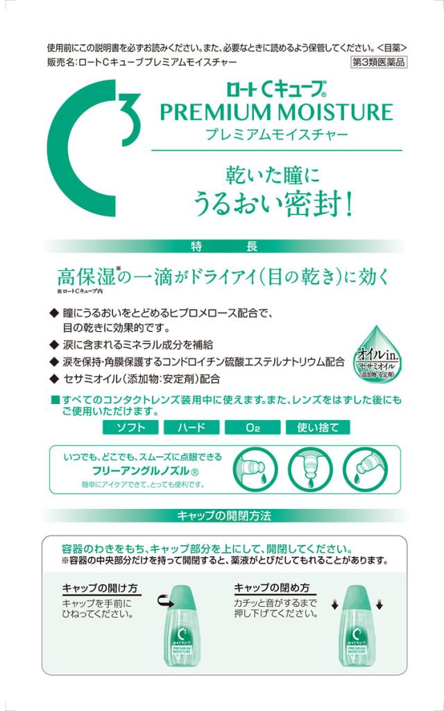 「ロートCキューブプレミアムモイスチャー 18mL」は、高保湿(ロートCキューブ内)の一滴が乾いた瞳にうるおいを与えて、ドライアイ(目の乾き)に効く、しみない目薬です。ヒプロメロースが瞳にうるおいを留めて目の乾きに効果的。塩化カリウムと塩化ナトリウムが、涙に含まれるミネラル成分を補給します。また涙を保持して角膜を保護するコンドロイチン硫酸エステルナトリウム配合。オイル成分としてセサミオイルも入れました。すべてのコンタクトレンズに対応。コンタクトレンズを装着していない目にもお使いいただけます。