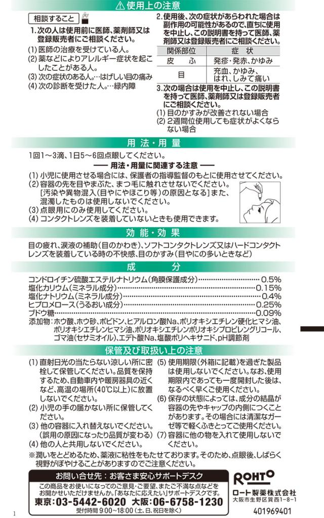 (1)小児に使用させる場合には、保護者の指導監督のもとに使用させてください。 (2)容器の先を目やまぶた、まつ毛に触れさせないでください。[汚染や異物混入(目やにやほこり等)の原因となる]また、混濁したものは使用しないでください。 (3)点眼用にのみ使用してください。 (4)コンタクトレンズを装着していないときも使用できます。