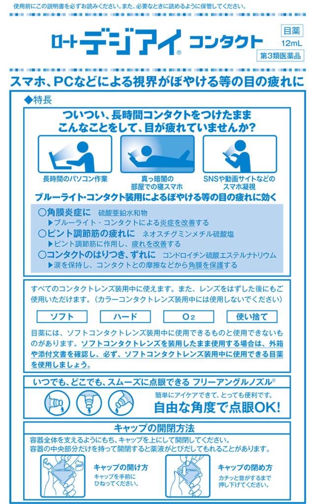 「ロートデジアイコンタクト 12mL」は、ブルーライトやコンタクトレンズの装用等による、ぼやける等の目の疲れに効く目薬です。ブルーライト・コンタクトレンズによる炎症を改善する<硫酸亜鉛水和物>、ピント調節筋に作用し、疲れを改善する<ネオスチグミンメチル硫酸塩>、涙を保持し、コンタクトレンズとの摩擦などから角膜を保護する<コンドロイチン硫酸エステルナトリウム>などを配合し、コンタクトレンズをつけてスマートフォン、パソコンを長時間使用する人にオススメな処方です。ソフトコンタクトレンズ、ハードコンタクトレンズ、O2レンズ、使い捨てコンタクトレンズなどの装用中に使えます。また、レンズをはずした後にもご使用いただけます。清涼感のある爽やかなさし心地。