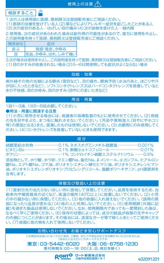 % 成分:分量 硫酸亜鉛水和物:0.1% ネオスチグミンメチル硫酸塩:0.001% ピリドキシン塩酸塩:0.1% 酢酸d-α-トコフェロール:0.01% アミノエチルスルホン酸(タウリン):1% コンドロイチン硫酸エステルナトリウム:0.5%