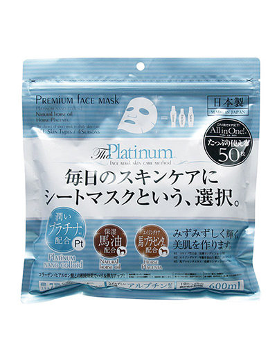 「進製作所 プレミアムフェイスマスク プラチナ 50枚」は、1枚で化粧水、乳液、美容液の3つの役割を果たすオールインワンタイプのフェイスマスクです。馬油と馬プラセンタをプラスしてリニューアルされました。みずみずしく潤いのあるお肌へ。毎日使える大容量。