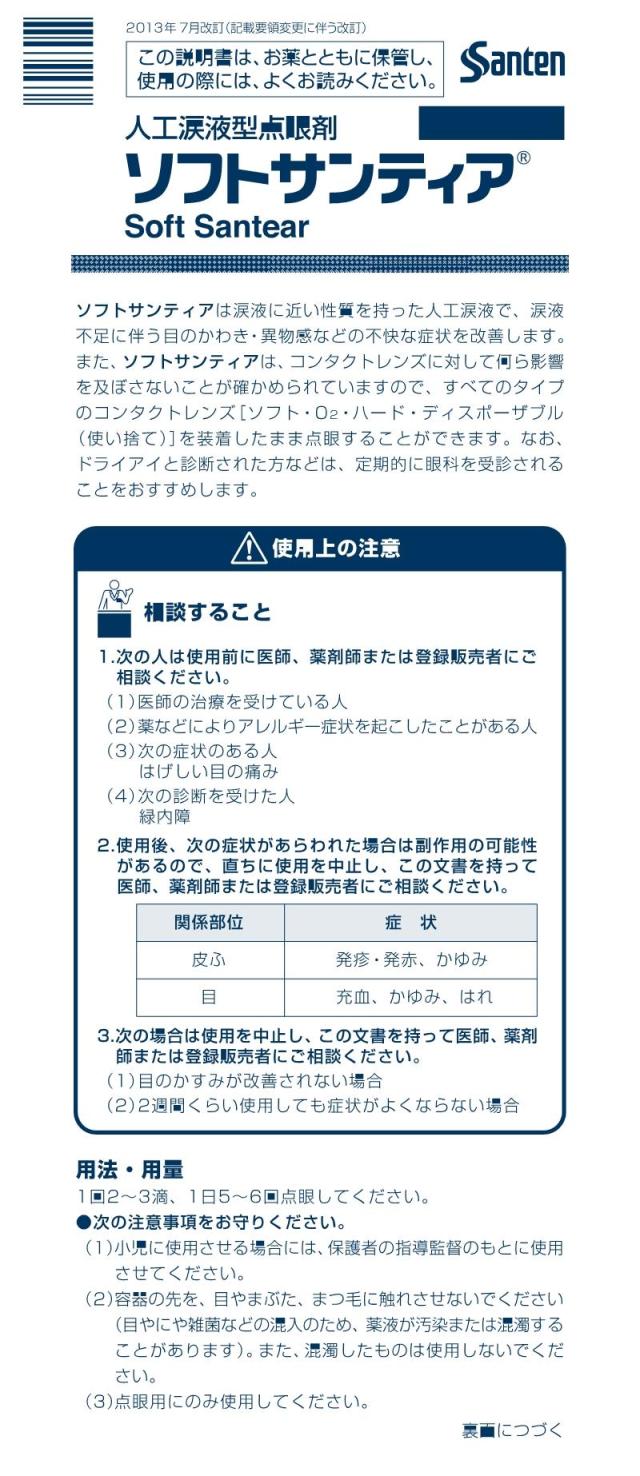 「ソフトサンティア」は、涙液に近い性質を持った人工涙液で、涙液不足に伴う目のかわき・異物感などの不快な症状を改善します。また、ソフトサンティアは、コンタクトレンズに対して何ら影響を及ぼさないことが確かめられていますので、すべてのタイプのコンタクトレンズ[ソフト・O2・ハード・ディスポーザブル(使い捨て)]を装着したまま点眼することができ、コンタクトレンズ装用時の不快感、目の疲れ、目のかすみ、目のかわきなどの諸症状を改善します。