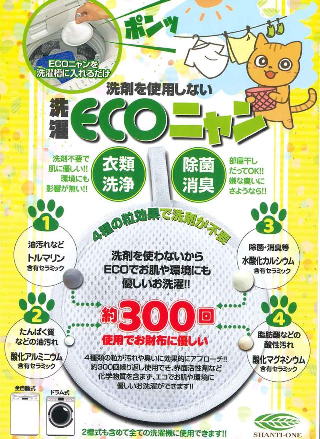 「洗濯ECOニャン」は、洗剤を使用せず、タンパク汚れ・油汚れ・脂肪酸などの汚れを溶出・分解する、酸化アルミニウム含有セラミック、酸化マグネシウム含有セラミック・トルマリン含有セラミック+除菌消臭効果の水酸化カルシウム含有セラミックの4種類の粒をバランスよく配合し、汚れや臭いに効果的にアプローチします。約300貝繰り返し使えて経済的。洗剤を使用しないので、すすぎ回数が減り、水の節約にも。全自動式、ドラム式、二層式洗濯機の全てに利用できます。