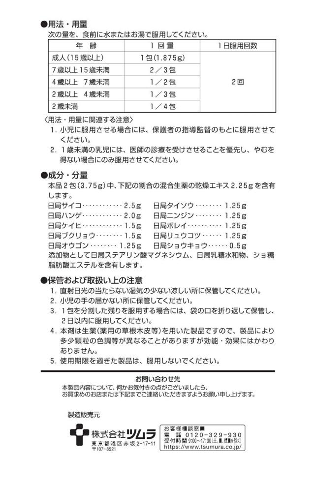 次の量を、食前に水またはお湯で服用してください。 [年齢:1回量:1日服用回数] 成人(15歳以上):1包(1.875g):2回 7歳以上15歳未満:2/3包:2回 4歳以上7歳未満:1/2包:2回 2歳以上4歳未満:1/3包:2回 2歳未満:1/4包:2回