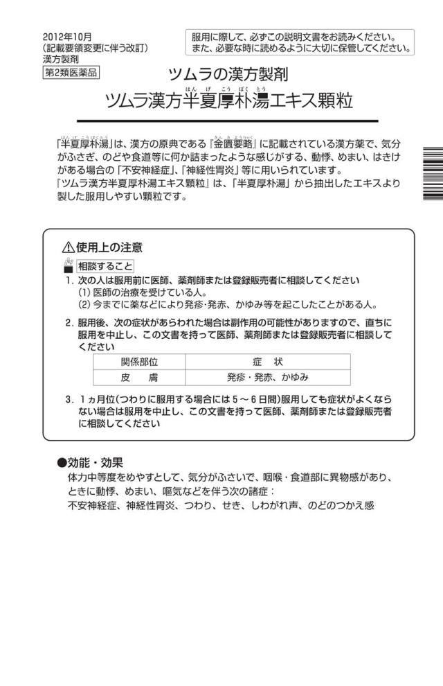 体力中等度をめやすとして、気分がふさいで、咽喉・食道部に異物感があり、ときに動悸、めまい、嘔気などを伴う次の諸症:不安神経症、神経性胃炎、つわり、せき、しわがれ声、のどのつかえ感