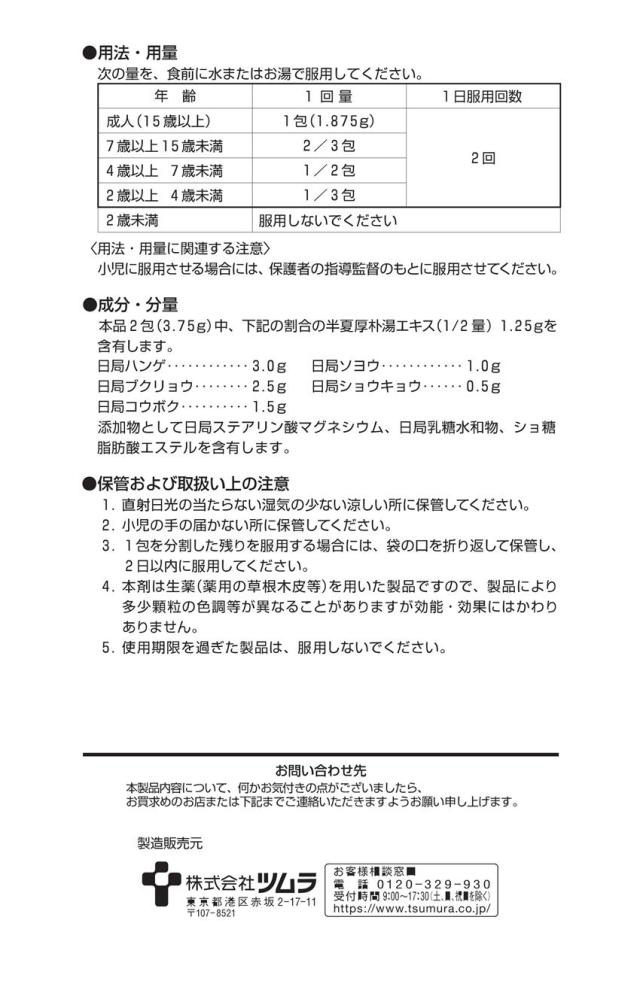 2包(3.75g)中 成分:分量:内訳 半夏厚朴湯エキス(1/2量):1.25g:(ハンゲ3g、ブクリョウ2.5g、コウボク1.5g、ソヨウ1g、ショウキョウ0.5g)
