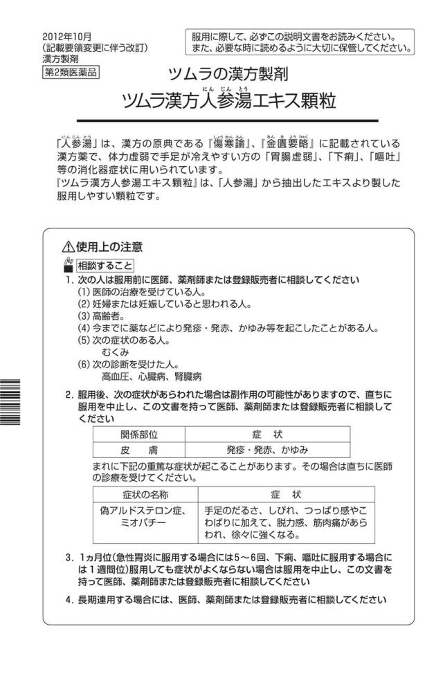 ■相談すること 1.次の人は服用前に医師、薬剤師または登録販売者に相談してください (1)医師の治療を受けている人。 (2)妊婦または妊娠していると思われる人。 (3)高齢者。 (4)今までに薬などにより発疹・発赤、かゆみ等を起こしたことがある人。 (5)次の症状のある人。 むくみ (6)次の診断を受けた人。 高血圧、心臓病、腎臓病 2.服用後、次の症状があらわれた場合は副作用の可能性がありますので、直ちに服用を中止し、この文書を持って医師、薬剤師または登録販売者に相談してください [関係部位:症状] 皮膚:発疹・発赤、かゆみ まれに次の重篤な症状が起こることがあります。その場合は直ちに医師の診療を受けてください。 [症状の名称:症状] 偽アルドステロン症:手足のだるさ、しびれ、つっぱり感やこわばりに加えて、脱力感、筋肉痛があらわれ、徐々に強くなる。 ミオパチー:手足のだるさ、しびれ、つっぱり感やこわばりに加えて、脱力感、筋肉痛があらわれ、徐々に強くなる。 3.1ヵ月位(急性胃炎に服用する場合には5〜6回、下痢、嘔吐に服用する場合には1週間位)服用しても症状がよくならない場合は服用を中止し、この文書を持って医師、薬剤師または登録販売者に相談してください 4.長期連用する場合には、医師、薬剤師または登録販売者に相談してください