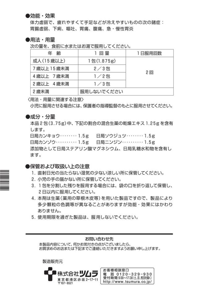 2包(3.75g)中 成分:分量:内訳 混合生薬乾燥エキス:1.25g:(カンキョウ・カンゾウ・ソウジュツ・ニンジン・各1.5g)