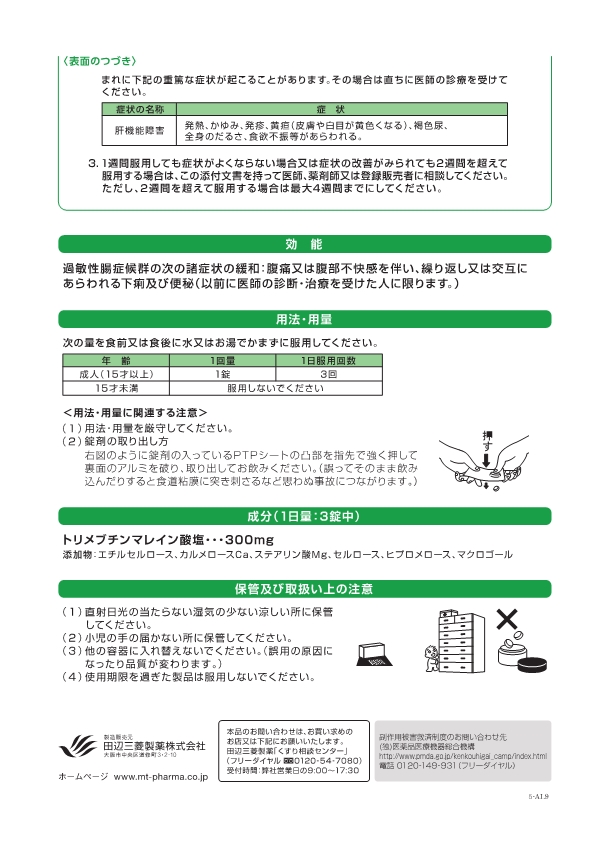 問合せ先名:田辺三菱製薬株式会社 問合せ先住所:大阪市中央区道修町3-2-10 問合せ先部署:くすり相談センター 問合せ先TEL:0120‐54‐7080 問合せ先受付時間:弊社営業日の9:00〜 17:30 上記以外の内容: