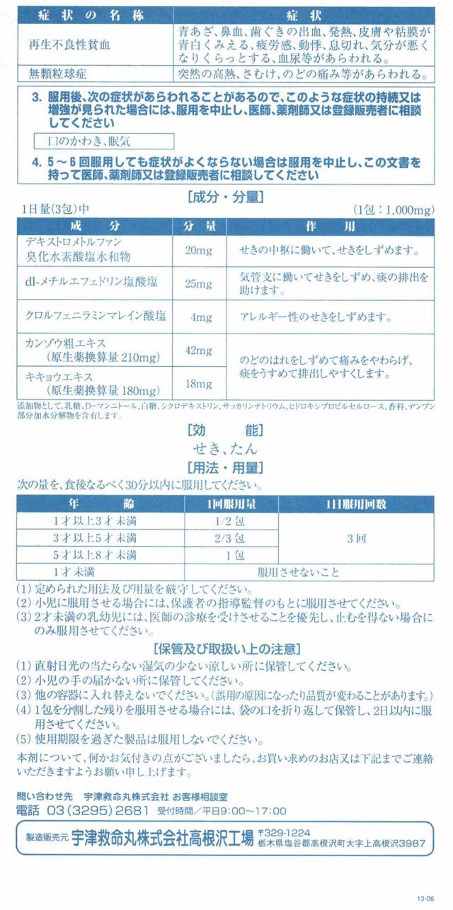 3包(3000mg)中 成分:分量:内訳 デキストロメトルファン臭化水素酸塩水和物:20mg: dl-メチルエフェドリン塩酸塩:25mg: クロルフェニラミンマレイン酸塩:4mg: カンゾウ粗エキス:42mg:(甘草210mg) キキョウエキス:18mg:(桔梗180mg)