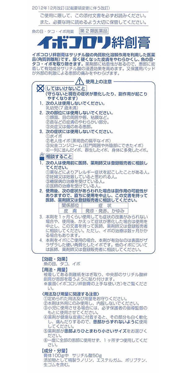 ■してはいけないこと (守らないと現在の症状が悪化したり、副作用が起こりやすくなります) 1.次の人は使用しないでください。 乳幼児(7歳未満) 2.次の部位には使用しないでください。 (1)顔面、目の周囲や唇、粘膜など。 (2)首などの皮膚のやわらかい部分。 (3)炎症又は傷のある患部。 3.次の症状には使用しないでください。 (1)水イボ (2)老人性イボ(黒褐色の扁平なイボ) (3)尖圭コンジローム(肛門周囲や外陰部にできたイボ) (4)一列に並んだイボ、群生したイボ、身体に多発したイボ。 ■相談すること 1.次の人は使用前に医師、薬剤師又は登録販売者に相談してください。 (1)薬などによりアレルギー症状を起こしたことがある人。 (2)妊婦又は妊娠していると思われる人。 (3)糖尿病の治療を受けている人。 (4)医師の治療を受けている人。 2.使用後、次の症状があらわれた場合は副作用の可能性がありますので、直ちに使用を中止し、この文書を持って医師、薬剤師又は登録販売者に相談してください。 [関係部位:症状] 皮膚:発疹・発赤、かゆみ 3.本剤を1ヶ月くらい使用しても症状の改善がみられない場合や、使用後、かえって症状が悪化した場合は使用を中止し、この文書を持って医師、薬剤師又は登録販売者に相談してください。ただし、イボの治療は数ヶ月かかる場合もあります。 4.本剤をイボにご使用の場合、本剤が有効なのは表面がザラザラした硬い角質化したイボです。他のイボについては医師、薬剤師又は登録販売者に相談してください。
