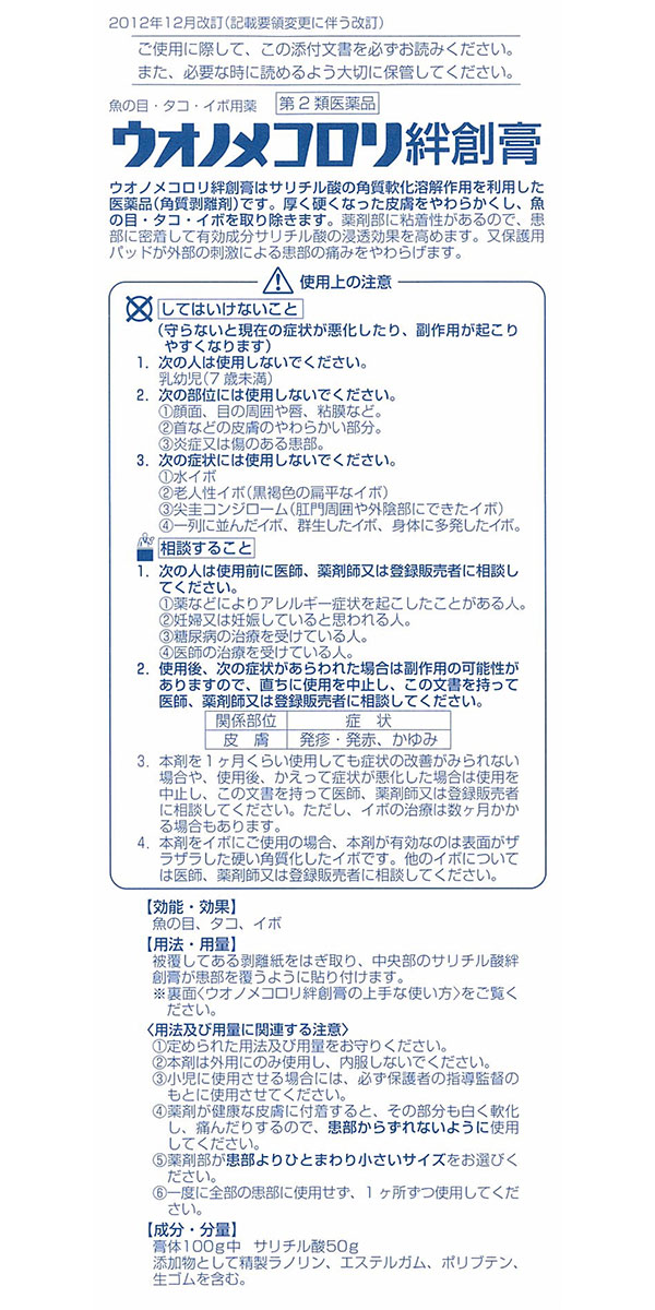 ■してはいけないこと (守らないと現在の症状が悪化したり、副作用が起こりやすくなります) 1.次の人は使用しないでください。 乳幼児(7歳未満) 2.次の部位には使用しないでください。 (1)顔面、目の周囲や唇、粘膜など。 (2)首などの皮膚のやわらかい部分。 (3)炎症又は傷のある患部。 3.次の症状には使用しないでください。 (1)水イボ (2)老人性イボ(黒褐色の扁平なイボ) (3)尖圭コンジローム(肛門周囲や外陰部にできたイボ) (4)一列に並んだイボ、群生したイボ、身体に多発したイボ。 ■相談すること 1.次の人は使用前に医師、薬剤師又は登録販売者に相談してください。 (1)薬などによりアレルギー症状を起こしたことがある人。 (2)妊婦又は妊娠していると思われる人。 (3)糖尿病の治療を受けている人。 (4)医師の治療を受けている人。 2.使用後、次の症状があらわれた場合は副作用の可能性がありますので、直ちに使用を中止し、この文書を持って医師、薬剤師又は登録販売者に相談してください。 [関係部位:症状] 皮膚:発疹・発赤、かゆみ 3.本剤を1ヶ月くらい使用しても症状の改善がみられない場合や、使用後、かえって症状が悪化した場合は使用を中止し、この文書を持って医師、薬剤師又は登録販売者に相談してください。ただし、イボの治療は数ヶ月かかる場合もあります。 4.本剤をイボにご使用の場合、本剤が有効なのは表面がザラザラした硬い角質化したイボです。他のイボについては医師、薬剤師又は登録販売者に相談してください。