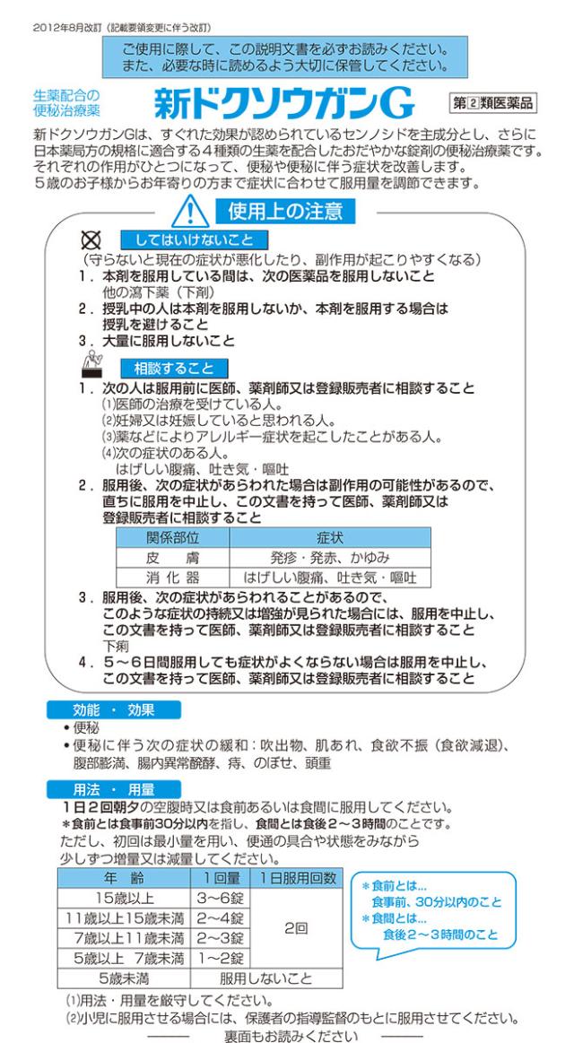 「新ドクソウガンG 168錠」は、すぐれた効果が認められているセンノシドを主成分とし、さらに日本薬局方の規格に適合する4種類の生薬を配合したおだやかな錠剤の便秘治療薬です。それぞれの作用がひとつになって、便秘や便秘に伴う症状を改善します。5歳のお子様からお年寄りの方まで症状に合わせて服用量を調節できます。