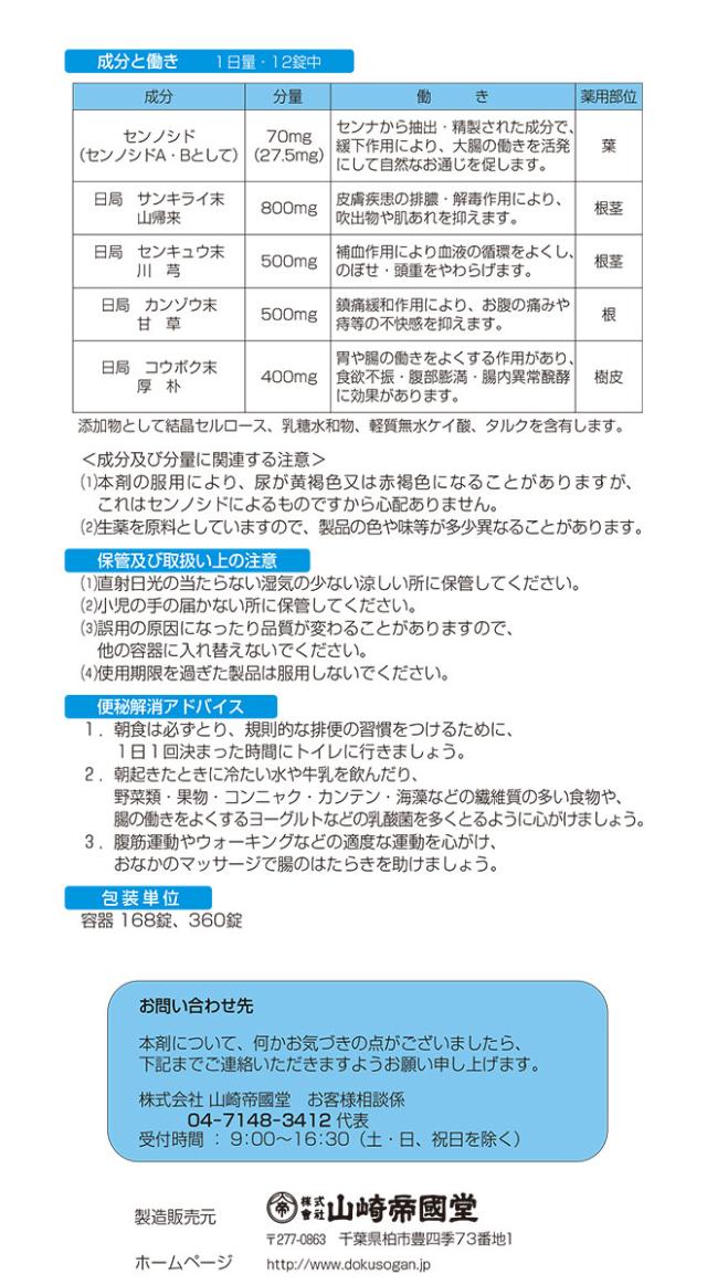 12錠中 成分:分量:内訳 センノシド:70mg:(センノシドA・B 27.5mg) サンキライ末:800mg: センキュウ末:500mg: カンゾウ末:500mg: コウボク末:400mg:
