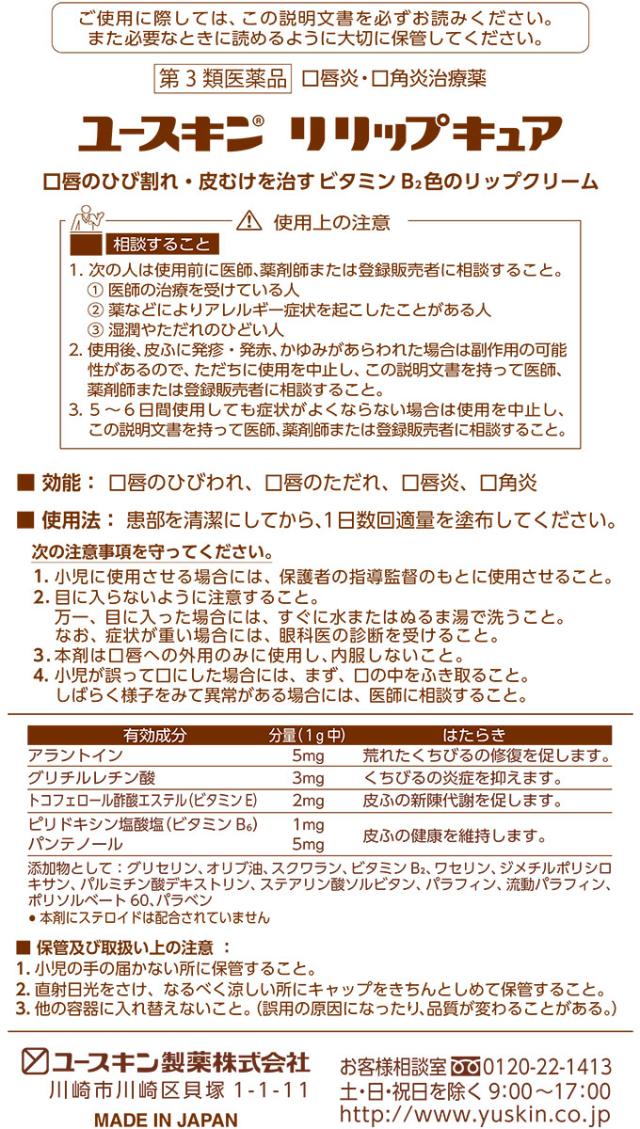 「ユースキン リリップキュア 8.5g」は、くちびるのひび割れや皮むけを治す、ビタミンB2(黄)色の医薬品リップクリームです。保湿性基剤成分(添加物)が、うるおいを与えます。 うるおいを与えて逃さない、モイストグリップ処方。くちびるを包み込むようなしっとり感で落ちにくい。無香料・ノンメントール。